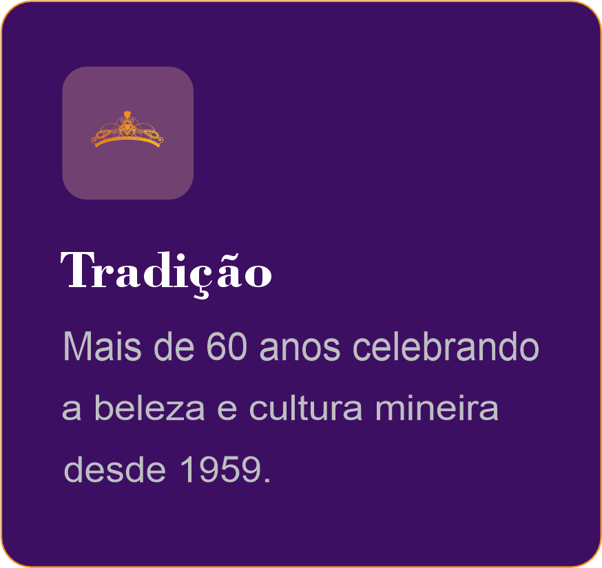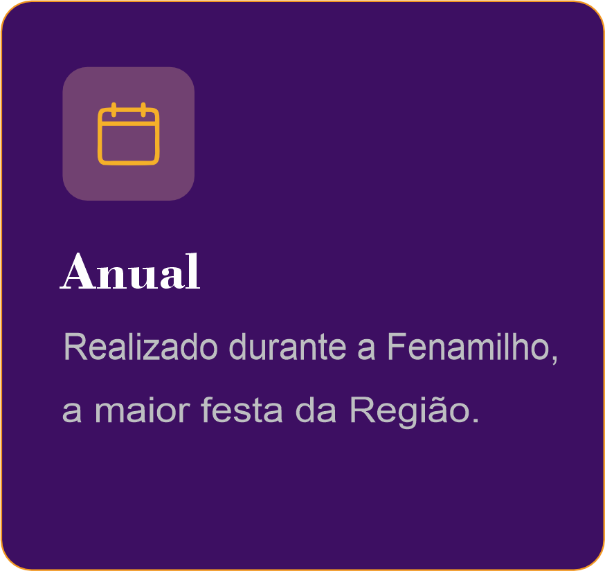 Concurso 2026 Galeria de rainhas Uma Tradição de Beleza Concurso 2026 Estamos preparando cada detalhe para o proximo concurso. Acompanhe as novidades! Saiba mais → Galeria de Rainhas Conheça todas as rainhas que fizeram história desde 1959. Saiba mais→ Fenamilho A Maior de Minas, realizada anualmente em Patos de Minas. Saiba mais→